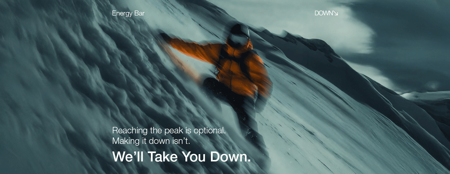 DOWN is an energy bar engineered for the summit moment, designed to support athletes during the descent, when focus replaces adrenaline and mistakes carry real consequences. It exists for those who understand that reaching the top is only half the task and that the way down demands equal respect, discipline, and clarity. The brand is built around the idea that performance does not end at achievement. It continues through control, awareness, and safe return.